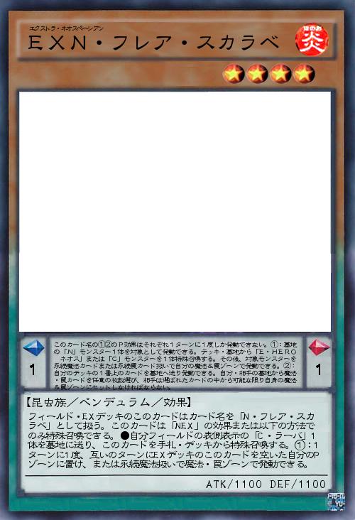 | フィールド・EXデッキのこのカードはカード名を「N・フレア・スカラベ」として扱う。このカードは「NEX」の効果または以下の方法でのみ特殊召喚できる。●自分フィールドの表側表示の「C・ラーバ」1体を墓地に送り、このカードを手札・デッキから特殊召喚する。①:1ターンに1度、互いのターンにEXデッキのこのカードを空いた自分のPゾーンに置け、または永続魔法扱いで魔法・罠ゾーンで発動できる。 | |||