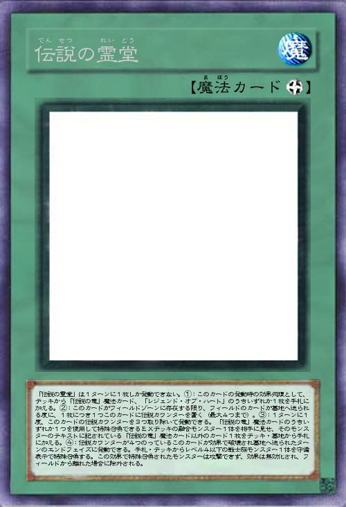| 「伝説の霊堂」は1ターンに1枚しか発動できない。①:このカードの発動時の効果処理として、デッキから「伝説の竜」魔法カード、「レジェンド・オブ・ハート」のうちいずれか1枚を手札に加える。②:このカードがフィールドゾーンに存在する限り、フィールドのカードが墓地へ送られる度に、1枚につき1つこのカードに伝説カウンターを置く(最大4つまで)。③:1ターンに1度、このカードの伝説カウンターを3つ取り除いて発動できる。「伝説の竜」魔法カードのうちいずれか1つを使用して特殊召喚できるEXデッキの融合モンスター1体を相手に見せ、そのモンスターのテキストに記されている「伝説の竜」魔法カード以外のカード1枚をデッキ・墓地から手札に加える。④:伝説カウンターが4つのっているこのカードが効果で破壊され墓地へ送られたターンのエンドフェイズに発動できる。手札・デッキからレベル4以下の戦士族モンスター1体を守備表示で特 | |||