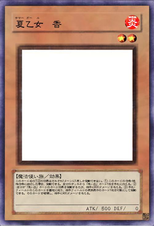| このカード名の①③の効果はそれぞれ1ターンに1度しか発動できない。①:このカードの召喚・特殊召喚に成功した場合、発動できる。自分のデッキから「思い出」カード1枚を手札に加える。②:自分が「思い出」カードのカード効果を発動するたび、相手に800ダメージを与える。③:手札・フィールドのこのカードを墓地に送り、相手フィールドの表側表示のカード1枚を対象にして発動できる。そのカードを破壊し、相手に400ダメージを与える。 | |||