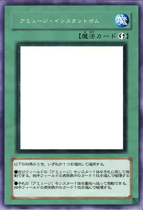 | 以下の効果のうち、いずれか1つを選択して適用する。 ●自分フィールドの「アミュージ」モンスター1体を手札に戻して発動できる。相手フィールドの表側表示のカード1枚を選んで破壊する。 ●手札の「アミュージ」モンスター1体を墓地へ送って発動できる。相手フィールドの表側表示のカード1枚を選んで破壊する。 | |||