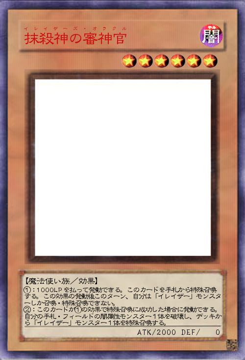| ①:1000LPを払って発動できる。このカードを手札から特殊召喚する。この効果の発動後このターン、自分は「イレイザー」モンスターしか召喚・特殊召喚できない。 ②:このカードが①の効果で特殊召喚に成功した場合に発動できる。自分の手札・フィールドの闇属性モンスター1体を破壊し、デッキから「イレイザー」モンスター1体を特殊召喚する。 | |||