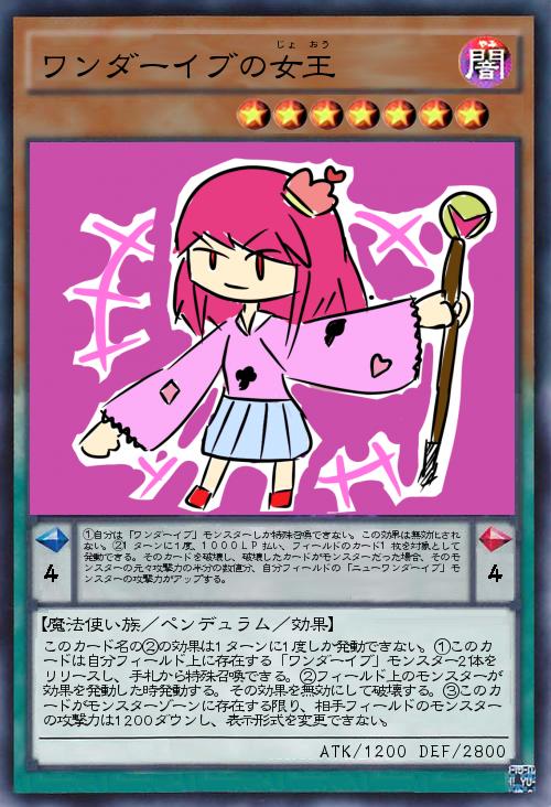 | このカード名の②の効果は1ターンに1度しか発動できない。①このカードは自分フィールド上に存在する「ワンダーイブ」モンスター2体をリリースし、手札から特殊召喚できる。②フィールド上のモンスターが効果を発動した時発動する。その効果を無効にして破壊する。③このカードがモンスターゾーンに存在する限り、相手フィールドのモンスターの攻撃力は1200ダウンし、表示形式を変更できない。 | |||