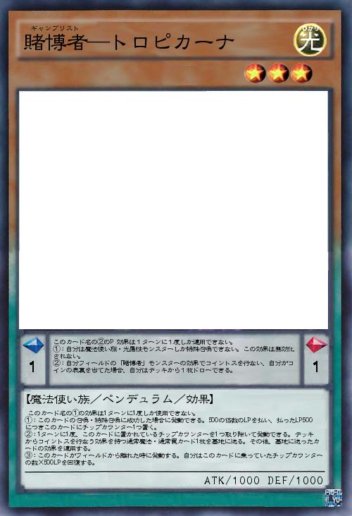 | このカード名の②のP効果は1ターンに1度しか適用できない。 ①:自分は魔法使い族・光属性モンスターしか特殊召喚できない。この効果は無効化されない。 ②:自分フィールドの「賭博者」モンスターの効果でコイントスを行ない、自分がコインの表裏を当てた場合、自分はデッキから1枚ドローできる。 | |||