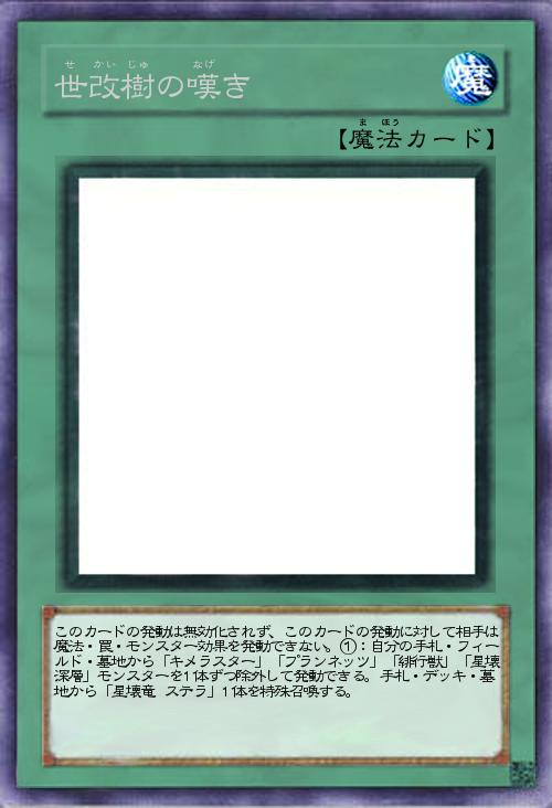 | このカードの発動は無効化されず、このカードの発動に対して相手は魔法・罠・モンスター効果を発動できない。①:自分の手札・フィールド・墓地から「キメラスター」「プランネッツ」「緋行獣」「星壊深層」モンスターを1体ずつ除外して発動できる。手札・デッキ・墓地から「星壊竜 ステラ」1体を特殊召喚する。 | |||