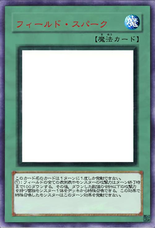 | このカード名のカードは1ターンに1度しか発動できない。 ①:フィールドの全ての表側表示モンスターの攻撃力はターン終了時まで100ダウンする。その後、ダウンした数値の合計以下の攻撃力を持つ雷族モンスター1体をデッキから特殊召喚できる。この効果で特殊召喚したモンスターはこのターン効果を発動できない。 | |||