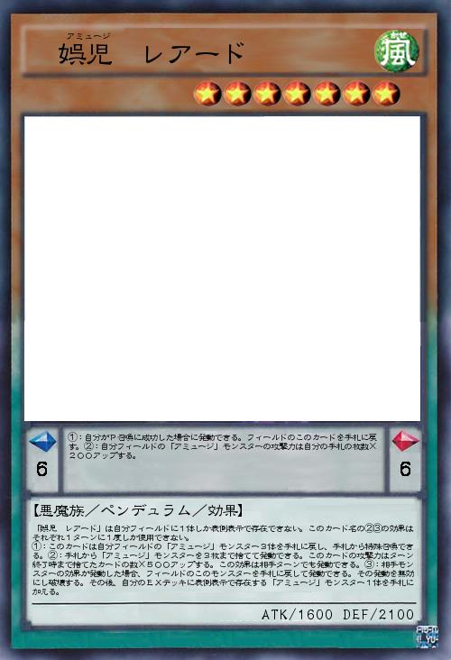 | 「娯児 レアード」は自分フィールドに1体しか表側表示で存在できない。このカード名の②③の効果はそれぞれ1ターンに1度しか使用できない。 ①:このカードは自分フィールドの「アミュージ」モンスター3体を手札に戻し、手札から特殊召喚できる。②:手札から「アミュージ」モンスターを3枚まで捨てて発動できる。このカードの攻撃力はターン終了時まで捨てたカードの数×500アップする。この効果は相手ターンでも発動できる。③:相手モンスターの効果が発動した場合、フィールドのこのモンスターを手札に戻して発動できる。その発動を無効にし破壊する。その後、自分のEXデッキに表側表示で存在する「アミュージ」モンスター1体を手札に加える。 | |||