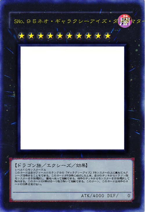 | レベル10モンスター×4 このカードは自分フィールドのランク9の「ギャラクシーアイズ」Xモンスターの上に重ねてエクシーズ召喚することもできる。このカードがX召喚に成功したとき、自分のデッキからドラゴン族モンスターを5体選択し、墓地へ送って発動できる。相手のデッキからモンスターを5体選択して除外する。このカードのX素材を一つ取り除いて発動できる。このターン、このカードは相手のカードの効果を受けない。 | |||