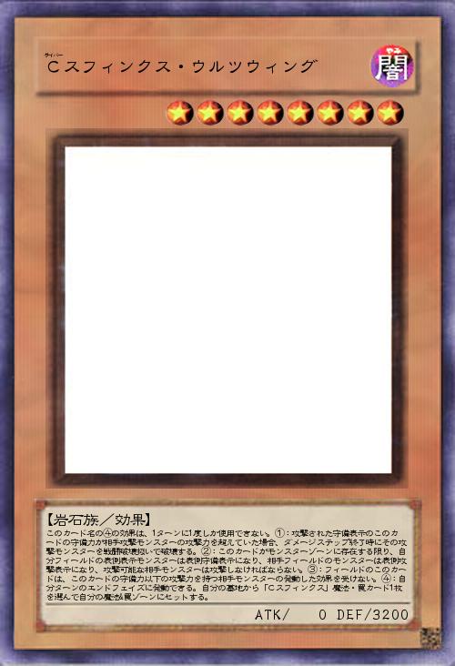 | このカード名の④の効果は、1ターンに1度しか使用できない。①:攻撃された守備表示のこのカードの守備力が相手攻撃モンスターの攻撃力を超えていた場合、ダメージステップ終了時にその攻撃モンスターを戦闘破壊扱いで破壊する。②:このカードがモンスターゾーンに存在する限り、自分フィールドの表側表示モンスターは表側守備表示になり、相手フィールドのモンスターは表側攻撃表示になり、攻撃可能な相手モンスターは攻撃しなければならない。③:フィールドのこのカードは、このカードの守備力以下の攻撃力を持つ相手モンスターの発動した効果を受けない。④:自分ターンのエンドフェイズに発動できる。自分の墓地から「Cスフィンクス」魔法・罠カード1枚を選んで自分の魔法&罠ゾーンにセットする。 | |||