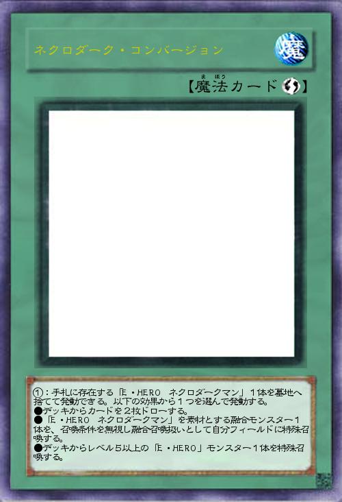 | ①:手札に存在する「E・HERO ネクロダークマン」1体を墓地へ捨てて発動できる。以下の効果から1つを選んで発動する。 ●デッキからカードを2枚ドローする。 ●「E・HERO ネクロダークマン」を素材とする融合モンスター1体を、召喚条件を無視し融合召喚扱いとして自分フィールドに特殊召喚する。 ●デッキからレベル5以上の「E・HERO」モンスター1体を特殊召喚する。 | |||