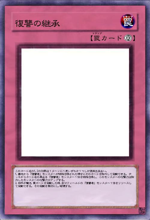 | このカード名の1,2の効果は1ターンに1度いずれか1つしか使用出来ない。 1,墓地から「復讐者」モンスターが特殊召喚された場合にそのカードを除外して発動できる。デッキからカード名の異なる「復讐者」モンスター1体を特殊召喚し、このモンスターの攻撃力は除外したモンスターの攻撃力分アップする。 2,相手が魔法,罠カードを発動した時,自分フィールドの「復讐者」モンスター1体をリリースして発動できる。その発動を無効にし,破壊する。 | |||