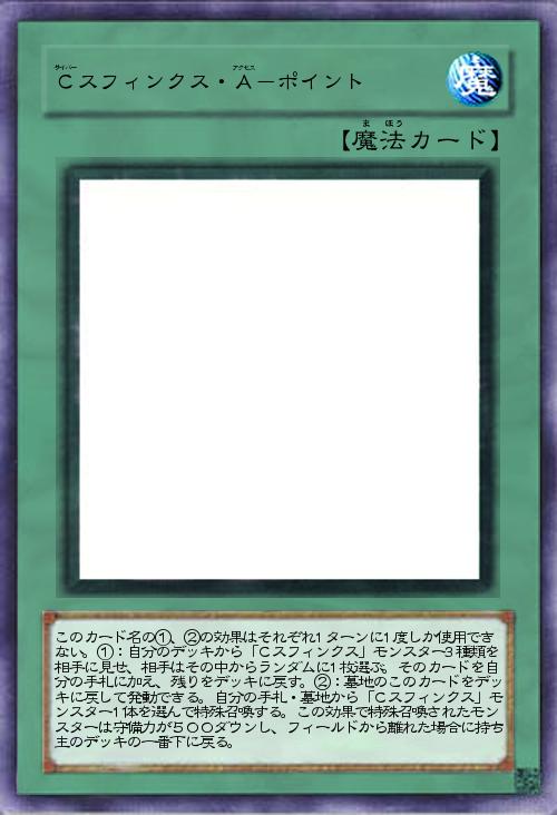 | このカード名の①、②の効果はそれぞれ1ターンに1度しか使用できない。①:自分のデッキから「Cスフィンクス」モンスター3種類を相手に見せ、相手はその中からランダムに1枚選ぶ。そのカードを自分の手札に加え、残りをデッキに戻す。②:墓地のこのカードをデッキに戻して発動できる。自分の手札・墓地から「Cスフィンクス」モンスター1体を選んで特殊召喚する。この効果で特殊召喚されたモンスターは守備力が500ダウンし、フィールドから離れた場合に持ち主のデッキの一番下に戻る。 | |||