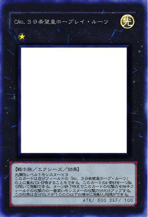 | 光属性レベル1モンスター×3 このカードは自分フィールドの「No.39希望皇ホープ・ルーツ」の上に重ねてX召喚することもできる。このカードのX素材を一つ取り除いて発動できる。ターン終了時までこのカードの攻撃力を相手フィールドの攻撃力の一番高いモンスターの攻撃力分だけアップする。この効果は自分のLPが1000以下の場合に発動と処理ができる。 | |||