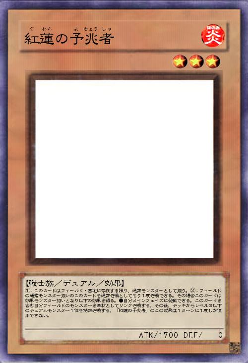 | ①:このカードはフィールド・墓地に存在する限り、通常モンスターとして扱う。②:フィールドの通常モンスター扱いのこのカードを通常召喚としてもう1度召喚できる。その場合このカードは効果モンスター扱いとなり以下の効果を得る。●自分メインフェイズに発動できる。このカードを含む自分フィールドのモンスターを素材としてリンク召喚する。その後、デッキからレベル3以下のデュアルモンスター1体を特殊召喚する。「紅蓮の予兆者」のこの効果は1ターンに1度しか使用できない。 | |||