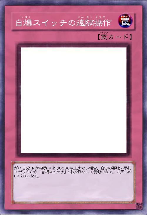 | ①:自分LPが相手LPより8000以上少ない場合、自分の墓地・手札・デッキから「自爆スイッチ」1枚を除外して発動できる。お互いのLPを0になる。 | |||
