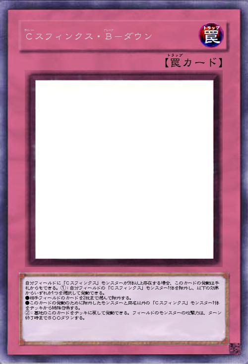| 自分フィールドに「Cスフィンクス」モンスターが3体以上存在する場合、このカードの発動は手札からもできる。①:自分フィールドの「Cスフィンクス」モンスター1体を除外し、以下の効果からいずれか1つを選択して発動できる。 ●相手フィールドのカードを2枚まで選んで除外する。 ●このカードの発動のために除外したモンスターと同名以外の「Cスフィンクス」モンスター1体をデッキから特殊召喚する。 ②:墓地のこのカードをデッキに戻して発動できる。フィールドのモンスターの攻撃力は、ターン終了時まで500ダウンする。 | |||