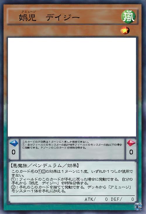 | このカード名の①②の効果は1ターンに1度、いずれか1つしか使用できない。 ①:フィールドのこのカードが手札に戻った場合に発動できる。自分の手札から「娯児 デイジー」を特殊召喚する。 ②:手札のこのカードを捨てて発動できる。デッキから「アミュージ」モンスター1体を手札に加える。 | |||