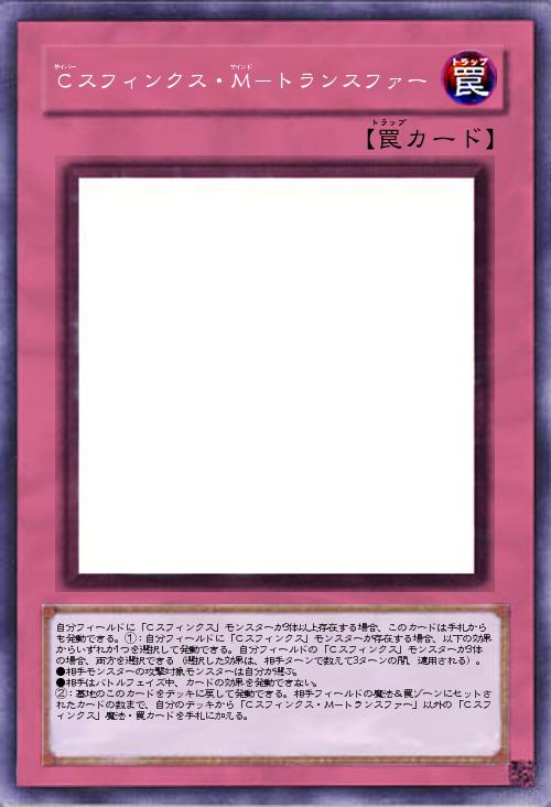 | 自分フィールドに「Cスフィンクス」モンスターが3体以上存在する場合、このカードは手札からも発動できる。①:自分フィールドに「Cスフィンクス」モンスターが存在する場合、以下の効果からいずれか1つを選択して発動できる。自分フィールドの「Cスフィンクス」モンスターが3体の場合、両方を選択できる(選択した効果は、相手ターンで数えて3ターンの間、適用される)。 ●相手モンスターの攻撃対象モンスターは自分が選ぶ。 ●相手はバトルフェイズ中、カードの効果を発動できない。 ②:墓地のこのカードをデッキに戻して発動できる。相手フィールドの魔法&罠ゾーンにセットされたカードの数まで、自分のデッキから「Cスフィンクス・M-トランスファー」以外の「Cスフィンクス」魔法・罠カードを手札に加える。 | |||