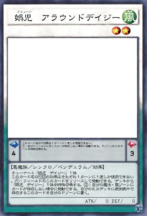 | チューナー+「娯児 デイジー」1体 このカード名の①②の効果はそれぞれ1ターンに1度しか使用できない。①:フィールドのこのカードをリリースして発動できる。デッキから「娯児 デイジー」1体を特殊召喚する。②:自分の魔法・罠ゾーンにカードが存在しない場合に発動できる。自分のEXデッキに表側表示で存在するこのカードを自分のPゾーンに置く。 | |||