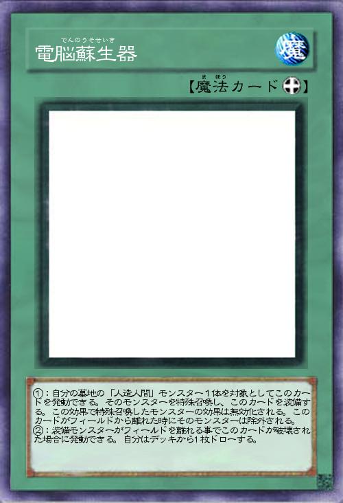 | ①:自分の墓地の「人造人間」モンスター1体を対象としてこのカードを発動できる。そのモンスターを特殊召喚し、このカードを装備する。この効果で特殊召喚したモンスターの効果は無効化される。このカードがフィールドから離れた時にそのモンスターは除外される。 ②:装備モンスターがフィールドを離れる事でこのカードが破壊された場合に発動できる。自分はデッキから1枚ドローする。 | |||