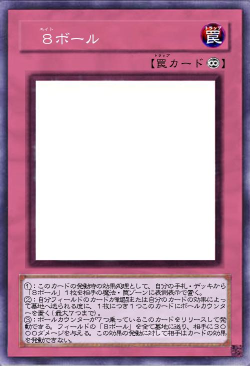 | ①:このカードの発動時の効果処理として、自分の手札・デッキから「8ボール」1枚を相手の魔法・罠ゾーンに表側表示で置く。 ②:自分フィールドのカードが戦闘または自分のカードの効果によって墓地へ送られる度に、1枚につき1つこのカードにボールカウンターを置く(最大7つまで)。 ③:ボールカウンターが7つ乗っているこのカードをリリースして発動できる。フィールドの「8ボール」を全て墓地に送り、相手に3000ダメージを与える。この効果の発動に対して相手はカードの効果を発動できない。 | |||