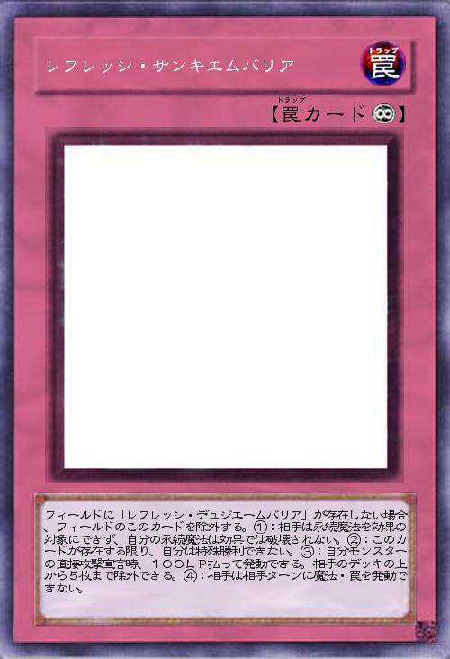 | フィールドに「レフレッシ・デュジエームバリア」が存在しない場合、フィールドのこのカードを除外する。①:相手は永続魔法を効果の対象にできず、自分の永続魔法は効果では破壊されない。②:このカードが存在する限り、自分は特殊勝利できない。③:自分モンスターの直接攻撃宣言時、100LP払って発動できる。相手のデッキの上から5枚まで除外できる。④:相手は相手ターンに魔法・罠を発動できない。 | |||