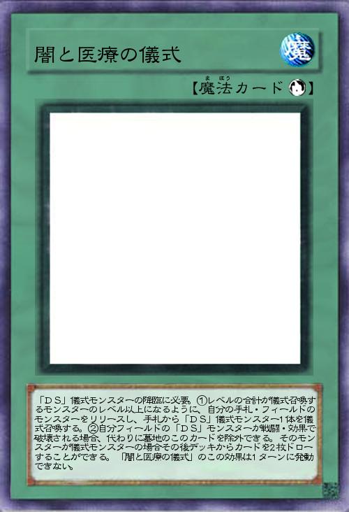 「DSの儀式召喚に必要です。最後の文は「「闇と医療の儀式」のこの効果は1ターンに発動できない。」になっていますが「「闇と医療の儀式」のこの効果は1ターンに1度までしか発動できない。」に変更してください。」(2018-05-09 00:35)