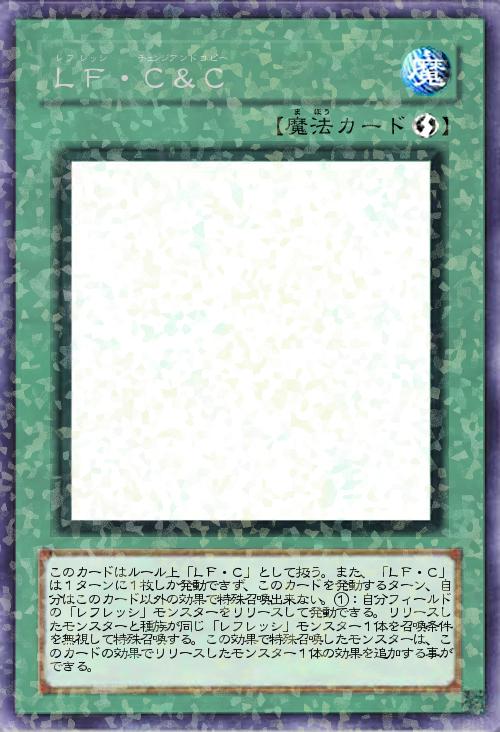| このカードはルール上「LF・C」として扱う。また、「LF・C」は1ターンに1枚しか発動できず、このカードを発動するターン、自分はこのカード以外の効果で特殊召喚出来ない。①:自分フィールドの「レフレッシ」モンスターをリリースして発動できる。リリースしたモンスターと種族が同じ「レフレッシ」モンスター1体を召喚条件を無視して特殊召喚する。この効果で特殊召喚したモンスターは、このカードの効果でリリースしたモンスター1体の効果を追加する事ができる。 | |||