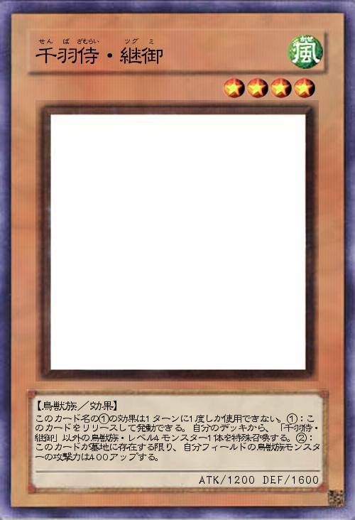 | このカード名の①の効果は1ターンに1度しか使用できない。①:このカードをリリースして発動できる。自分のデッキから、「千羽侍・継御」以外の鳥獣族・レベル4モンスター1体を特殊召喚する。②:このカードが墓地に存在する限り、自分フィールドの鳥獣族モンスターの攻撃力は400アップする。 | |||