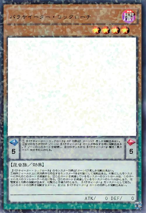 | 『パラサイーター・コックローチ』のモンスター効果は1ターンに1度しか発動出来ない。 ①相手フィールド上に表側表示で存在するモンスター1体を対象にして発動出来る。対象にしたモンスターに手札のこのカードを装備する。②このカードを装備しているモンスターのコントロールは、このカードの元々のコントローラーの元に移る。③このカードを装備しているモンスターのレベルは4となり、攻撃宣言と効果の発動が出来ず、攻撃力と守備力が0となり、『パラサイーター』モンスターとして扱う。④このカードの効果を発動するターン、自分は『パラサイーター』カードの効果しか発動出来ない。 | |||