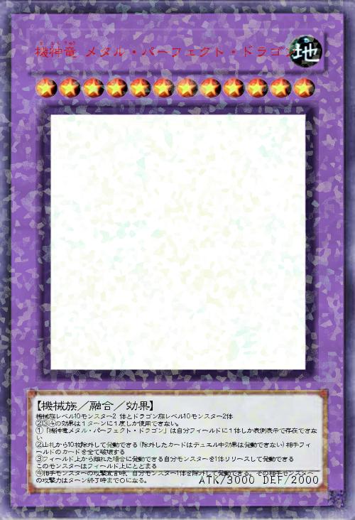 | 機械族レベル10モンスター2 体とドラゴン族レベル10モンスター2体 ②③④の効果は1ターンに1度しか使用できない。 ①「機神竜メタル・パーフェクト・ドラゴン」は自分フィールドに1体しか表側表示で存在できない ②山札から10枚除外して発動できる(除外したカードはデュエル中効果は発動できない)相手フィールドのカードを全て破壊する ③フィールド上から離れた場合に発動できる自分モンスターを1体リリースして発動できる このモンスターはフィールド上にとどまる ④相手モンスターの攻撃宣言時、自分モンスター1体を除外して発動できる。その相手モンスターの攻撃力はターン終了時まで0になる。 | |||