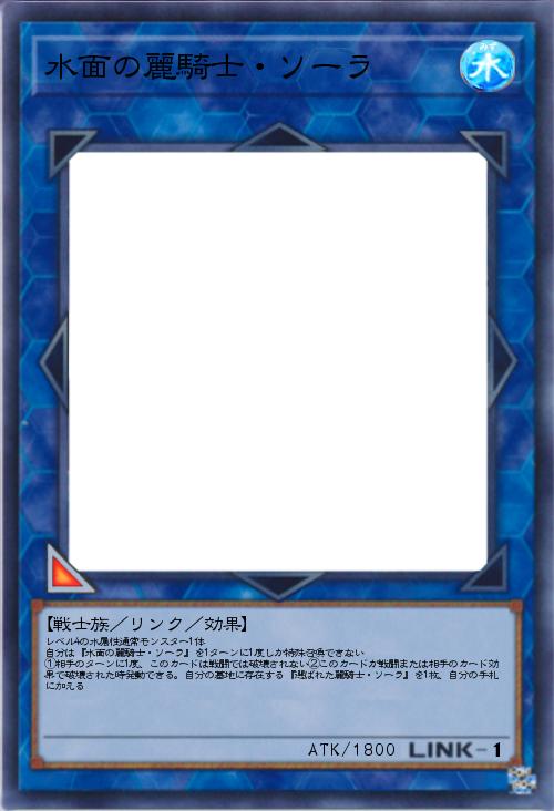 | レベル4の水属性通常モンスター1体 自分は『水面の麗騎士・ソーラ』を1ターンに1度しか特殊召喚できない ①相手のターンに1度、このカードは戦闘では破壊されない②このカードが戦闘または相手のカード効果で破壊された時発動できる。自分の墓地に存在する『選ばれた麗騎士・ソーラ』を1枚、自分の手札に加える | |||
