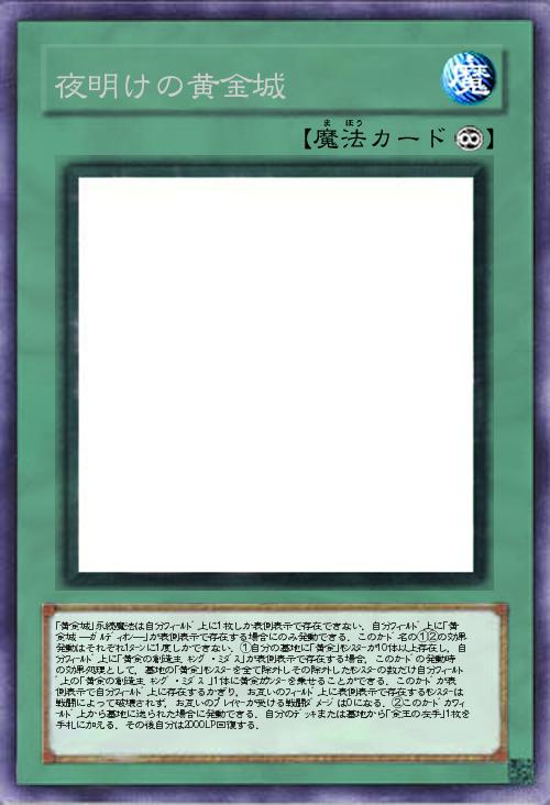 | 「黄金城」永続魔法は自分フィ-ルド上に1枚しか表側表示で存在できない.自分フィ-ルド上に「黄金城 ─ガルディオン─」が表側表示で存在する場合にのみ発動できる.このカ-ド名の①②の効果発動はそれぞれ1タ-ンに1度しかできない.①自分の墓地に「黄金」モンスタ-が10体以上存在し,自分フィ-ルド上に「黄金の創造主 キング・ミダス」が表側表示で存在する場合,このカ-ドの発動時の効果処理として,墓地の「黄金」モンスタ-を全て除外しその除外したモンスタ-の数だけ自分フィ-ルド上の「黄金の創造主 キング・ミダス 」1体に黄金カウンタ-を乗せることができる.このカ-ドが表側表示で自分フィ-ルド上に存在するかぎり,お互いのフィ-ルド上に表側表示で存在するモンスタ-は戦闘によって破壊されず,お互いのプレイヤ-が受ける戦闘ダメ-ジは0になる.②このカ-ドがフィ-ルド上から | |||