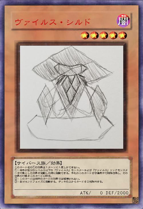 相手が小型ヴァイルス及びヴァイルスLを対象とした効果を発動した時に手札から出てきて、対象を自身へと移し替えるまさしく盾な存在。身を挺して仲間をかばう様は、ウイルスながらかっこいい。が、ただやられて終わるのではなく、自身には相手からの効果破壊耐性を持ち合わせているため、対象をとる破壊であれば仲間をかばい傷も負わぬと、すごくかっこよい感じに!除外とか、バウンスとか墓地送りは範囲外。エンドにはデッキトップ2枚を除外できるので、除外肥やしが進みます。全体的に見てもなかなかに扱いやすい防御札!ここぞという時に相手の1手を妨害してさしあげやがりましょう。FFはテキストのはき違えで間違えたりもしそうですから、よく理解して注意しとかないとですね…(汗。