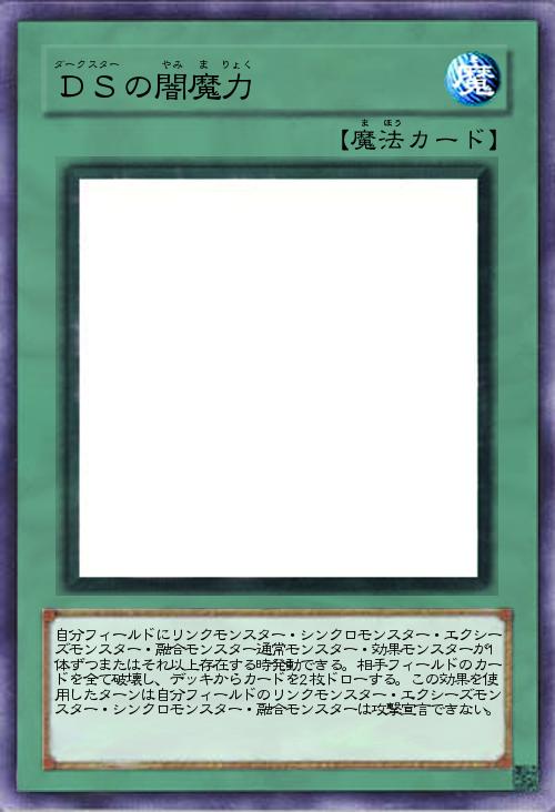 | 自分フィールドにリンクモンスター・シンクロモンスター・エクシーズモンスター・融合モンスター通常モンスター・効果モンスターが1体ずつまたはそれ以上存在する時発動できる。相手フィールドのカードを全て破壊し、デッキからカードを2枚ドローする。この効果を使用したターンは自分フィールドのリンクモンスター・エクシーズモンスター・シンクロモンスター・融合モンスターは攻撃宣言できない。 | |||
