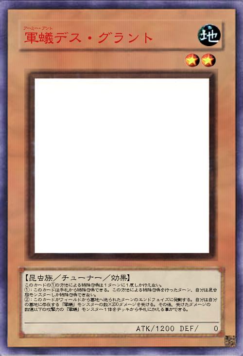 | このカードの①の方法による特殊召喚は1ターンに1度しか行えない。 ①:このカードは手札から特殊召喚できる。この方法による特殊召喚を行ったターン、自分は昆虫族モンスターしか特殊召喚できない。 ②:このカードがフィールドから墓地へ送られたターンのエンドフェイズに発動する。自分は自分の墓地に存在する「軍蟻」モンスターの数×200ダメージを受ける。その後、受けたダメージの数値以下の攻撃力の「軍蟻」モンスター1体をデッキから手札に加える事ができる。 | |||