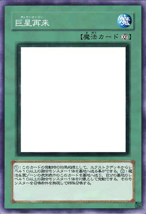 | ①:このカードの発動時の効果処理として、エクストラデッキからレベル10以上の融合モンスター1体を墓地へ送る事ができる。②:魔法&罠ゾーンの表側表示のこのカードを墓地へ送り、自分の墓地のレベル10以上の融合モンスター1体を対象として発動できる。そのモンスターを召喚条件を無視して特殊召喚する。 | |||