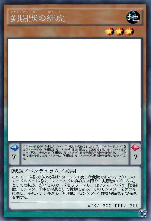| このカード名のP効果は1ターンに1度しか発動できない。①:このカード以外の自分フィールドの「剣闘獣」モンスター1体を対象として発動できる。そのカードをデッキに戻し、手札から「剣闘獣」モンスター1体を守備表示で特殊召喚する。この効果で特殊召喚したモンスターは「剣闘獣」モンスターの効果で特殊召喚した扱いになる。 | |||