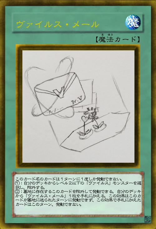 | このカード名のカードは1ターンに1度しか発動できない。 ①:自分のデッキからレベル2以下の「ヴァイルス」モンスターを選択し、除外する。 ②:墓地に存在するこのカードを除外して発動できる。自分のデッキから「ヴァイルス・メール」1枚を手札に加える。この効果はこのカードが墓地に送られたターンに発動できず、この効果で手札に加えたカードはこのターン、発動できない。 | |||