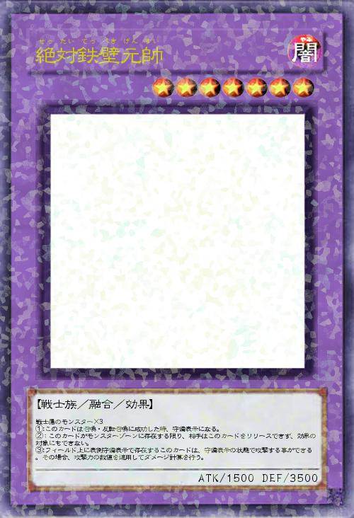 | 戦士属のモンスター×3 ①:このカードは召喚・反転召喚に成功した時、守備表示になる。 ②:このカードがモンスターゾーンに存在する限り、相手はこのカードをリリースできず、効果の対象にもできない。 ③:フィールド上に表側守備表示で存在するこのカードは、守備表示の状態で攻撃する事ができる。その場合、攻撃力の数値を適用してダメージ計算を行う。 | |||