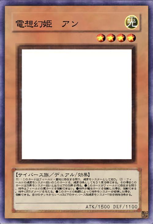 | (1):このカードはフィールド・墓地に存在する限り、通常モンスターとして扱う。(2):フィールドの通常モンスター扱いのこのカードを、通常召喚としてもう1度召喚できる。その場合このカードは効果モンスター扱いとなり以下の効果を得る。●このカードがフィールドに存在する限り、相手はフィールドの罠カードを発動できない。●相手が魔法カードを発動した場合、発動できる。相手に800ダメージを与える。●このカードの戦闘によって相手モンスターを破壊した場合、発動できる。自分のデッキからレベル3以下のサイバース族通常モンスター1体を特殊召喚する。 | |||