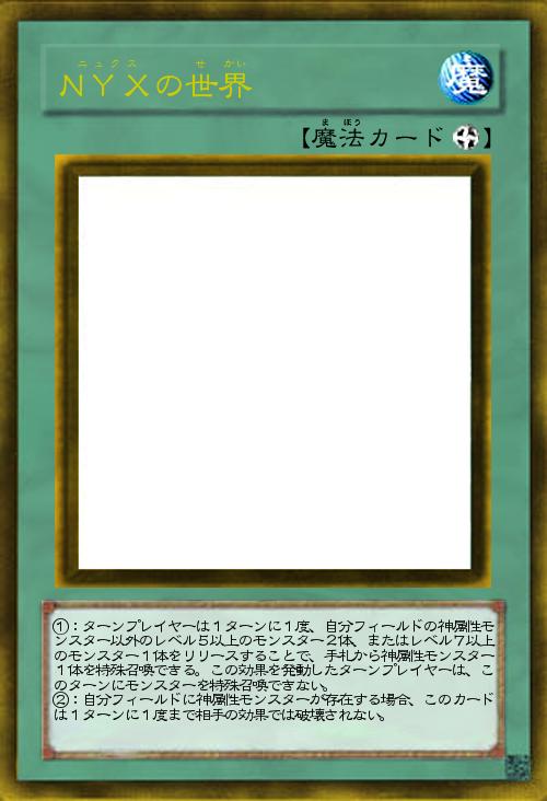 最初はその親、夜の神「ニュクス」がモチーフとなったフィールド魔法カード。むしろこれがないと「NYX」モンスターは動かない、依存性が非常に高いカード。その夜の世界で神属性モンスターのサポートを行います。相手も利用できるので相手がオベリスク等を使用している場合は出される可能性があります。」(2018-05-21 19:57)