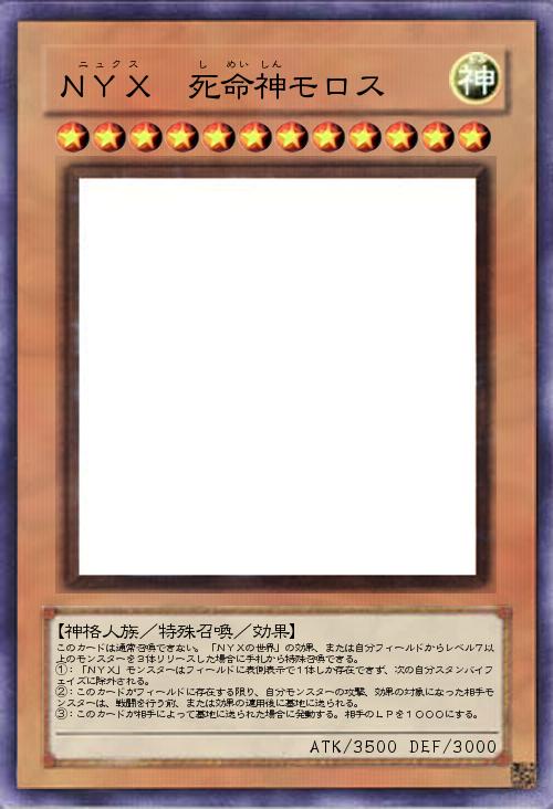 | このカードは通常召喚できない。「NYXの世界」の効果、または自分フィールドからレベル7以上のモンスターを3体リリースした場合に手札から特殊召喚できる。 ①:「NYX」モンスターはフィールドに表側表示で1体しか存在できず、次の自分スタンバイフェイズに除外される。 ②:このカードがフィールドに存在する限り、自分モンスターの攻撃、効果の対象になった相手モンスターは、戦闘を行う前、または効果の適用後に墓地に送られる。 ③:このカードが相手によって墓地に送られた場合に発動する。相手のLPを1000にする。 | |||