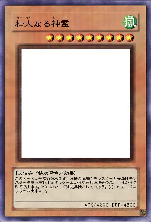| このカードは通常召喚出来ず、墓地の風属性モンスターと光属性モンスターをそれぞれ1体ずつゲームから除外した場合のみ、手札から特殊召喚出来る。①このカードは光属性としても扱う。②このカードはリリース出来ない。 | |||