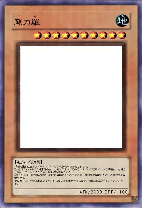 | 「剛力羅」は自分フィールドに1体しか表側表示で存在できない。 ①:自分フィールドの通常召喚されたモンスターがそのモンスターの効果によって破壊された場合、手札、デッキからこのカードを特殊召喚できる。 ②:モンスターが召喚に成功した時に発動するそのモンスターの効果が発動した時、この効果を発動できる。 そのモンスターの効果はフィールドに存在する限り無効になり、攻撃力は500ポイントアップする。 | |||