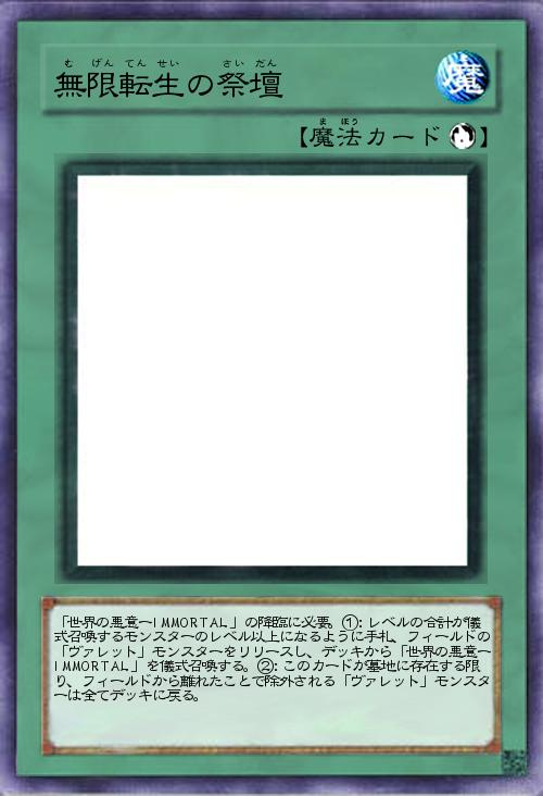 | 「世界の悪意ーIMMORTAL」の降臨に必要。①:レベルの合計が儀式召喚するモンスターのレベル以上になるように手札、フィールドの「ヴァレット」モンスターをリリースし、デッキから「世界の悪意ーIMMORTAL」を儀式召喚する。②:このカードが墓地に存在する限り、フィールドから離れたことで除外される「ヴァレット」モンスターは全てデッキに戻る。 | |||