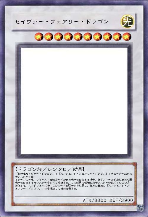 | 「救世竜セイヴァー・ドラゴン」+「エンシェント・フェアリー・ドラゴン」+チューナー以外のモンスター1体 1ターンに一度、フィールド魔法カードが表側表示で存在する場合、相手フィールド上に表側攻撃表示で存在するモンスターをすべて破壊する。この効果で破壊したモンスターの数×1000LP回復する。エンドフェイズ時、このカードをEXデッキに戻し、自分の墓地の「エンシェント・フェアリー・ドラゴン」1体を選択して特殊召喚する。 | |||