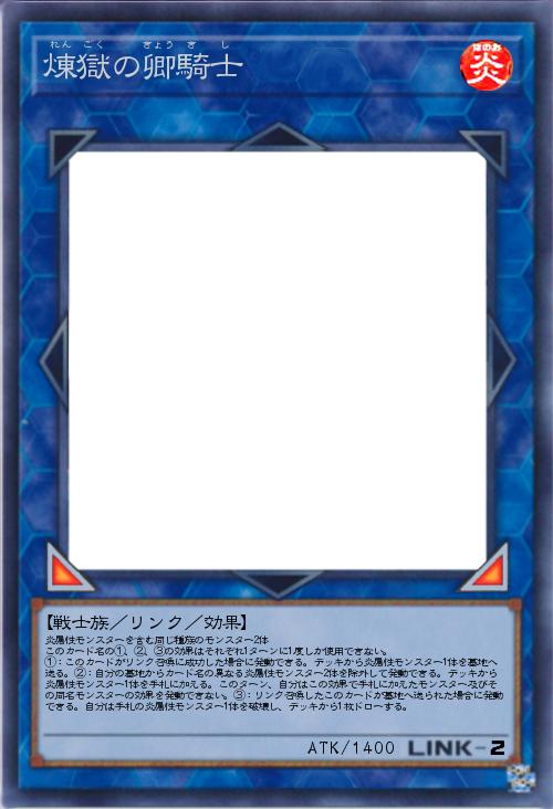 | 炎属性モンスターを含む同じ種族のモンスター2体 このカード名の①、②、③の効果はそれぞれ1ターンに1度しか使用できない。 ①:このカードがリンク召喚に成功した場合に発動できる。デッキから炎属性モンスター1体を墓地へ送る。②:自分の墓地からカード名の異なる炎属性モンスター2体を除外して発動できる。デッキから炎属性モンスター1体を手札に加える。このターン、自分はこの効果で手札に加えたモンスター及びその同名モンスターの効果を発動できない。③:リンク召喚したこのカードが墓地へ送られた場合に発動できる。自分は手札の炎属性モンスター1体を破壊し、デッキから1枚ドローする。 | |||