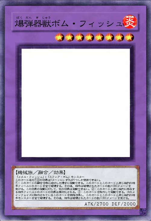| 「メタル・フィッシュ」+「スフィア・ボム」モンスター このカード名の①③の効果は1ターンにいずれか1つしか使用できない。 ①:このカードの融合召喚に成功した場合に発動できる。このカードとこのカードと同じ縦列の相手フィールドのカードを全て破壊する。その後、相手は破壊されたカードの数×300ダメージを受ける。この効果の発動に対して、他の効果は発動できない。②:このカードと同じ縦列に存在する相手フィールドのカードの効果は無効化される。③:このカードを除外して発動できる。次のメインフェイズに除外されているこのカードを特殊召喚し、このカードとこのカードと同じ縦列の相手モンスターを全て破壊する。その後、相手は破壊されたカードの数×300ダメージを受ける。 | |||