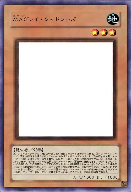 | ①:フィールドゾーンに「霧」が存在しない場合このカードはデッキに戻る。②:フィールドゾーンに「霧」が存在する場合に自分フィールドの「ウィドワーズトークン」(昆虫族・地・星1・攻/守100)2体をリリースする事で、このカードはデッキから特殊召喚できる。③:このカードが同じ縦列の相手モンスターを攻撃したダメージステップ開始時に発動できる。相手に800ダメージを与える。この戦闘によって互いのモンスターは戦闘破壊されない。④:このカードが相手モンスターと戦闘を行ったダメージステップ終了時に発動できる。その相手モンスターにエッグカウンターを2つ置く。エッグカウンターが置かれたモンスターがフィールドを離れた時、自分フィールドに「ウィドワーズトークン」を置かれていたエッグカウンターの数だけ特殊召喚する。 | |||