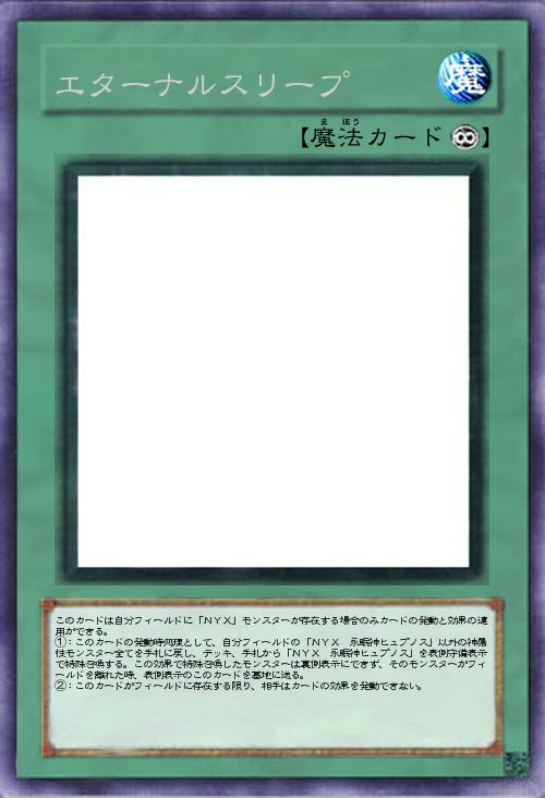 | このカードは自分フィールドに「NYX」モンスターが存在する場合のみカードの発動と効果の適用ができる。 ①:このカードの発動時処理として、自分フィールドの「NYX 永眠神ヒュプノス」以外の神属性モンスター全てを手札に戻し、デッキ、手札から「NYX 永眠神ヒュプノス」を表側守備表示で特殊召喚する。この効果で特殊召喚したモンスターは裏側表示にできず、そのモンスターがフィールドを離れた時、表側表示のこのカードを墓地に送る。 ②:このカードがフィールドに存在する限り、相手はカードの効果を発動できない。 | |||